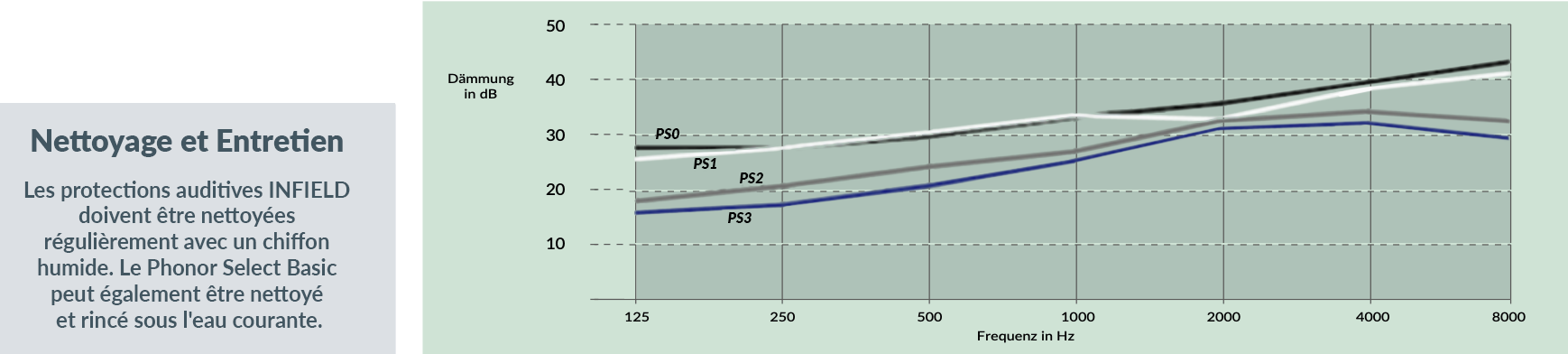 | Otoplastie de haute qualité avec une adaptation parfaite grâce à une fabrication individuelle | Moins d'atténuation à 4000 Hz, d'où une meilleure compréhension de la parole |